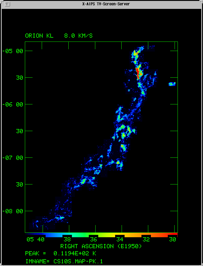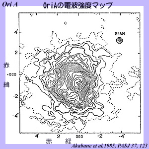 Orion Nebula is not visible in visible light, but it is completely by the radio wave. By measuring the radio wave intensity in detail, we can find the state of the HII region and the intensity of the ultraviolet ray. オリオン星雲は,電離水素領域なので,そこにある自由電子から電波が放射されています. 太陽系に比較的近い電離水素領域なので,強い電波源として古くから認識されており, オリオン座で最強の電波連続波源として,「オリオン座A」と呼ばれることもあります. 12′×12′の範囲を電波強度に応じた等高線で示してあります. 図中のBEAMと付記された円が分解能を示します. 同じ領域の可視光の写真と比べてみると, 電波を放射している領域が星雲として光っている領域とほぼ一致していることが分かりますが, 詳細に比較してみると, 可視光は星間塵によって減光されている部分でも,電波ではちゃんと見えていることが分かります. 電波強度を詳細に測ることによって, 電離水素領域の状態やそれを光らせている恒星の紫外線強度などを知ることができます. 図の中心付近の電波が一番強いところは, トラペジウムのθ1Oriと一致していて, この星がオリオン星雲を光らせていることもはっきりとわかります. | |