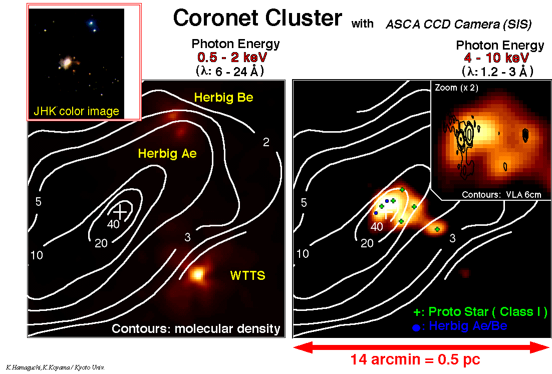上は原始星のフレア時に,あすか のSIS検出器で撮影したX線スペクトルです. X線を放射しているプラズマガスの温度は約1億度にもなります. また注目すべきは,6から7keV付近に鉄の輝線が2本あることです. 6keVから7keV付近の輝線スペクトルは, 非常に高温のプラズマ中で高度に電離した鉄イオンから放射されたものだと思われますが, エネルギーの偏移などもありそうで, 高速の物質の噴出などを伴っているのかもしれません. By courtesy of K.Hamaguchi, K.Koyama / Kyoto Univ. |