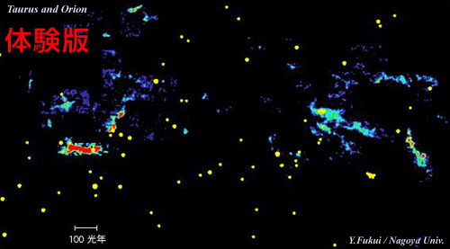 この中には, 小さい星が生まれている距離450光年のおうし座分子雲(右側のかたまり)と, 重たい星が生まれている距離1500光年にあるオリオン座分子雲(左側のかたまり, 3つ星をはさんで上と左にあるもの)が目立ちます. 左下の100光年のスケールは,オリオン座分子雲についてのスケールです. 資料提供:福井康雄(名古屋大学) |