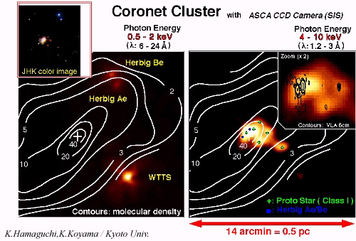 上は原始星のフレア時に,あすか のSIS検出器で撮影したX線スペクトルです. X線を放射しているプラズマガスの温度は約1億度にもなります. また注目すべきは,6から7keV付近に鉄の輝線が2本あることです. 6keVから7keV付近の輝線スペクトルは, 非常に高温のプラズマ中で高度に電離した鉄イオンから放射されたものだと思われますが, エネルギーの偏移などもありそうで, 高速の物質の噴出などを伴っているのかもしれません. By courtesy of K.Hamaguchi, K.Koyama / Kyoto Univ. |