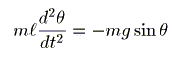 長さ l のひもにぶら下げられた質量 m の質点の運動を式に表わします。 平面内で運動させるようにすると、ひもと鉛直方向のなす角を Θ、 重力加速度を g として、下のように書くことができます。