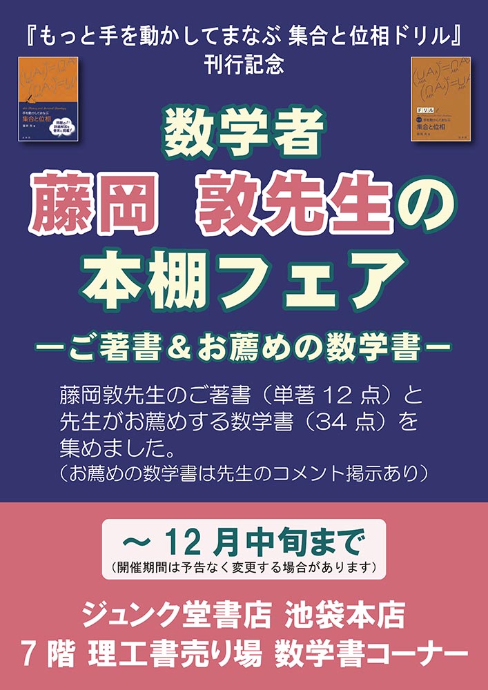 数学者・藤岡敦先生による待望の新刊『もっと手を動かしてまなぶ集合と位相ドリル』(裳華房,2025年9月)の刊行を記念して、藤岡先生のご著書(単著)12点と、先生お薦めの数学書34点を大展開しています。