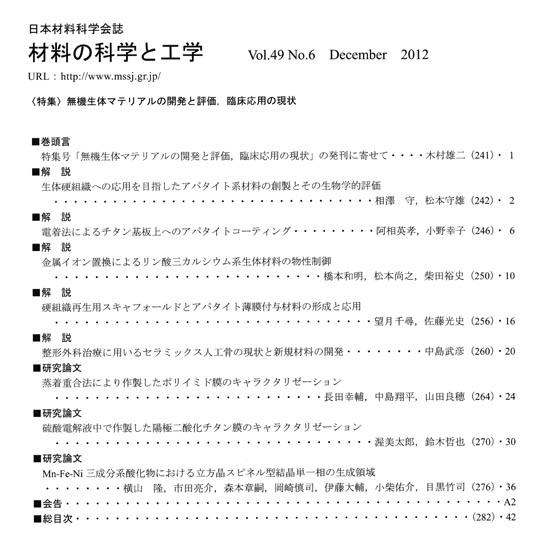 「材料の科学と工学」49巻(2012年)6号 特集:無機生体マテリアルの開発と評価,臨床応用の現状 ![]() |