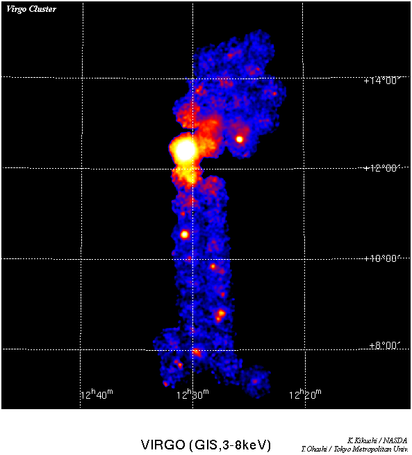 Since it is a cluster in the nearest distance, it is a target best for observing even fine structure in detail. In ASCA, mapping observation of the Virgo Cluster was performed to research that clarifies temperature structure of the high temperature gas which accompanies a cluster was done. The top is the observing point of mapping observation. A circle is a observed point by ASCA (GIS) and it is equivalent to the view of ASCA. The blue circle is observed and just going to be analyzed until now. The red circle shows the planning point to be observed in 1999. Moreover, a green point is expressed the whole sky by ROSAT. By courtesy of K.Kikuchi / NASDA, T.Ohashi / Tokyo Metropolitan Univ. | |